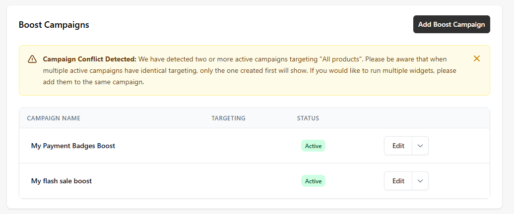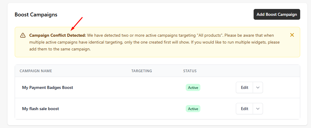 The app notifies you on the dashboard when a campaign conflict is detected.