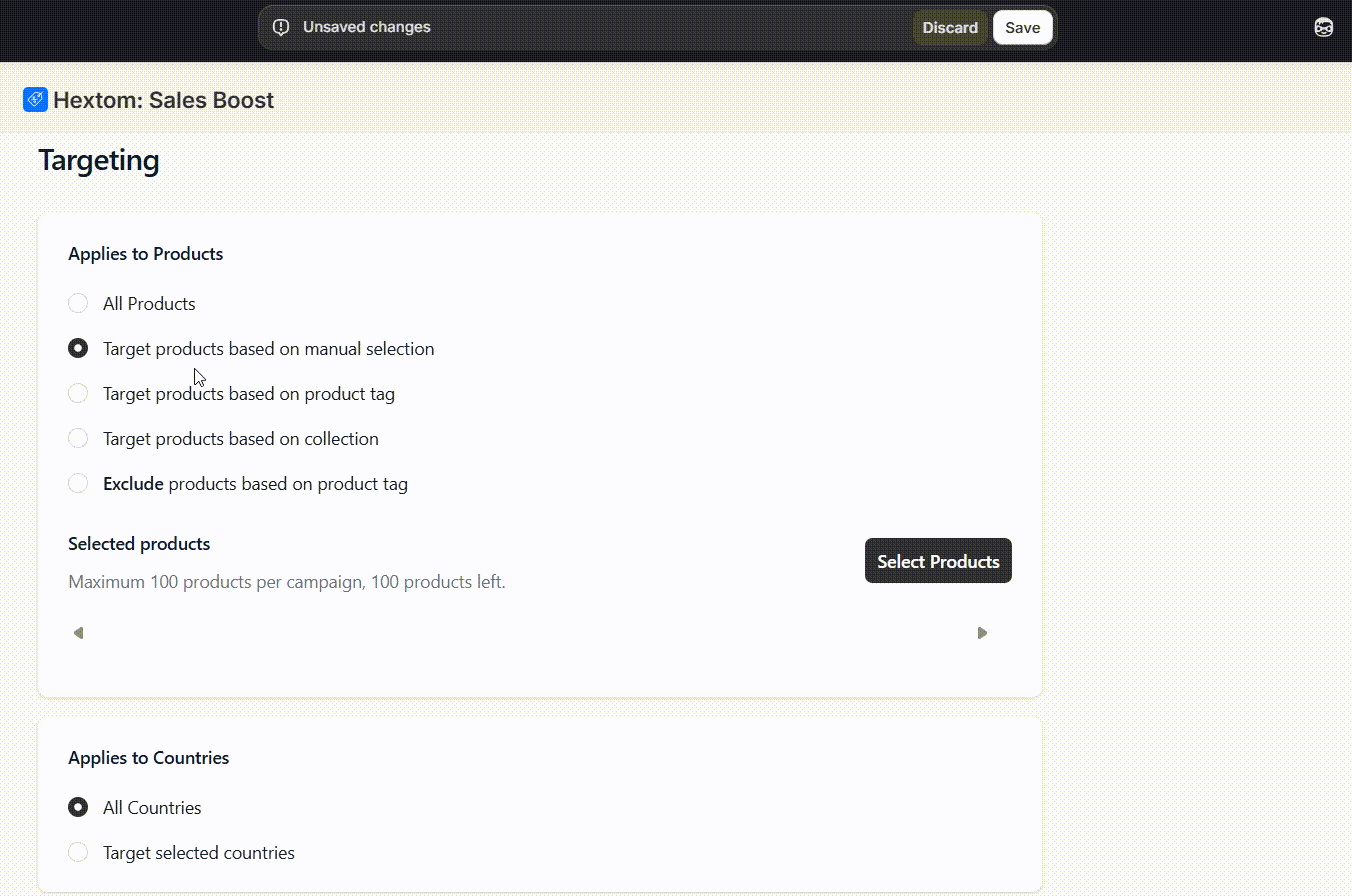 The Applies to Products component enables you to target a campaign to specific products, either by manual selection, product tags, or product collections.
