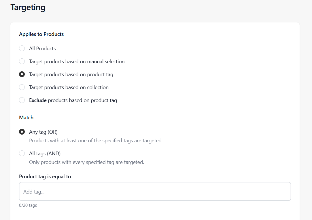 The targeting by product tag has a limitation: it does not apply to subsequent batches of products on scroll to load collection pages. Shopify provides product tag information only for the initial batch of products. Therefore, we recommend avoiding this targeting method if the products are part of a scroll to load collection page.