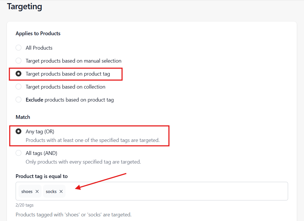 For example, if we wanted to create a campaign that only shows on products tagged with "shoes" OR "socks", we can use the following settings to do so.