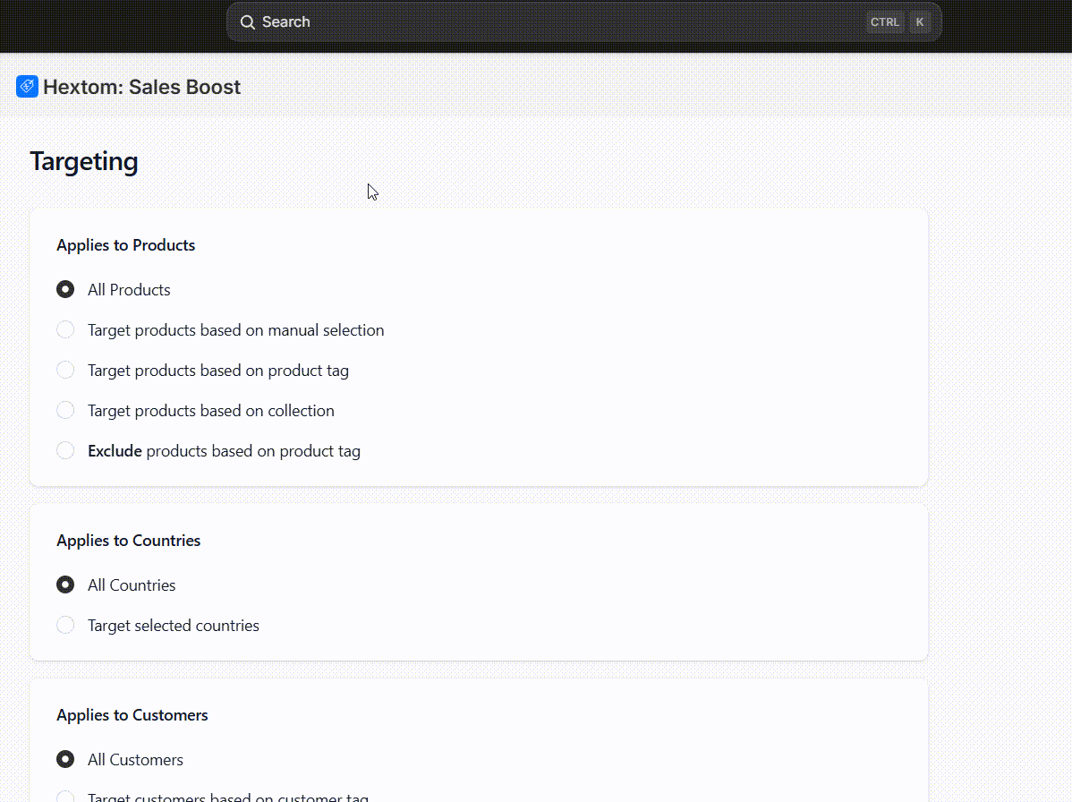 The Upsell Sales Boost app offers a powerful feature that lets you target each campaign to specific products, customers, or dates.