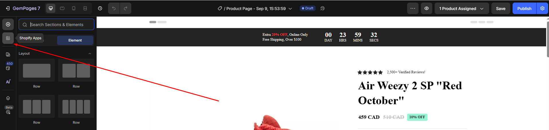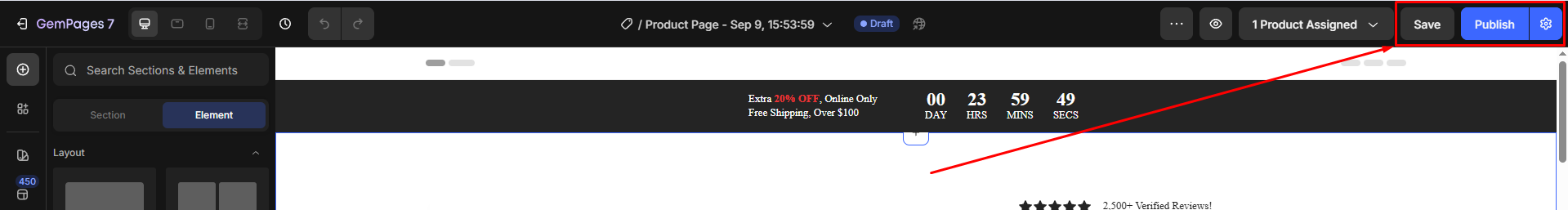 After positioning and configuring, click Save and Publish your changes in GemPages.