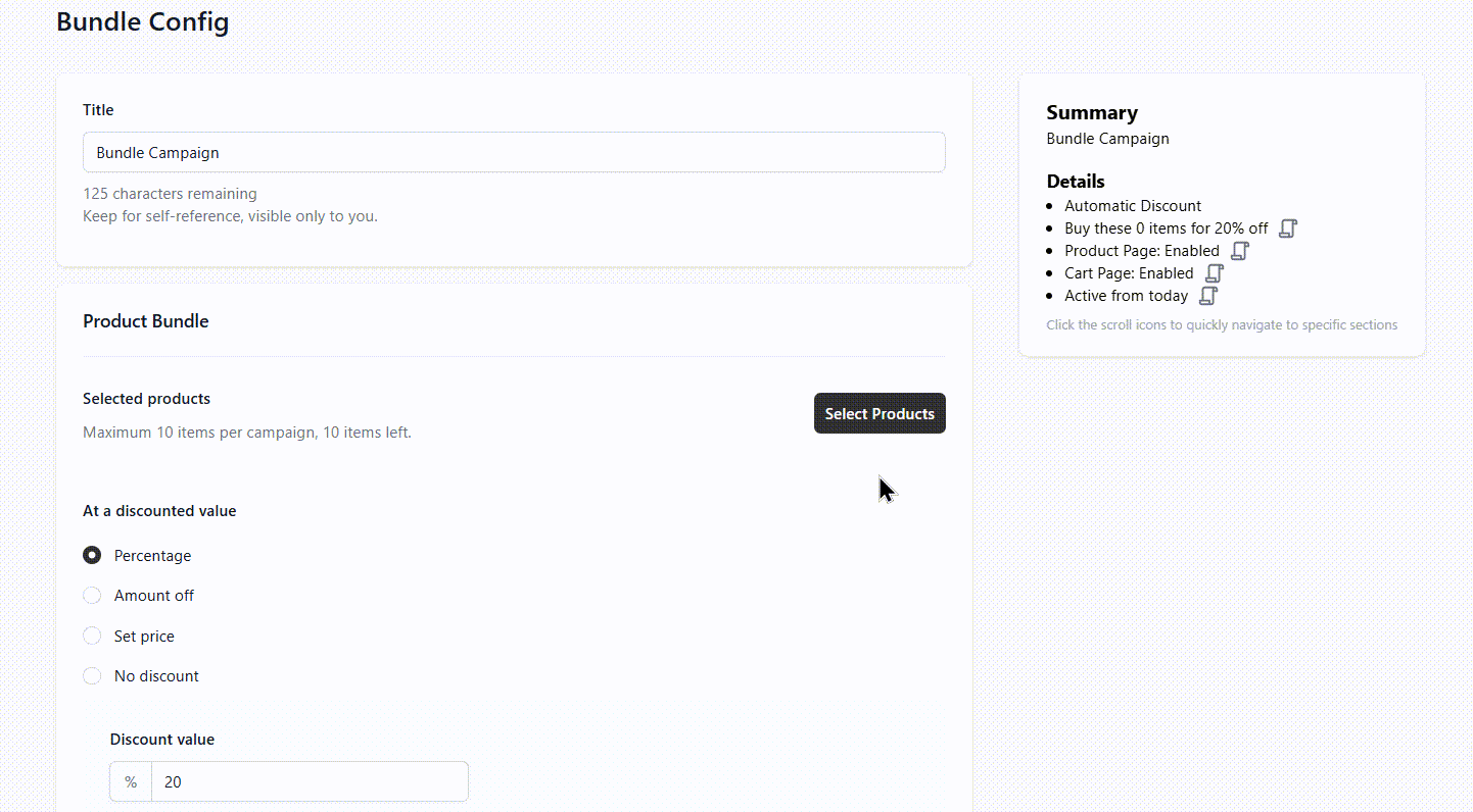 - Percentage off – Apply a percentage discount to the bundle (e.g., 15% off)