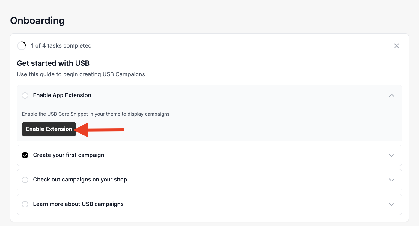 - From the app's onboarding section, click the dropdown for Enable app extension. Then click the Enable Extension button. This will redirect to the Shopify Theme Editor.