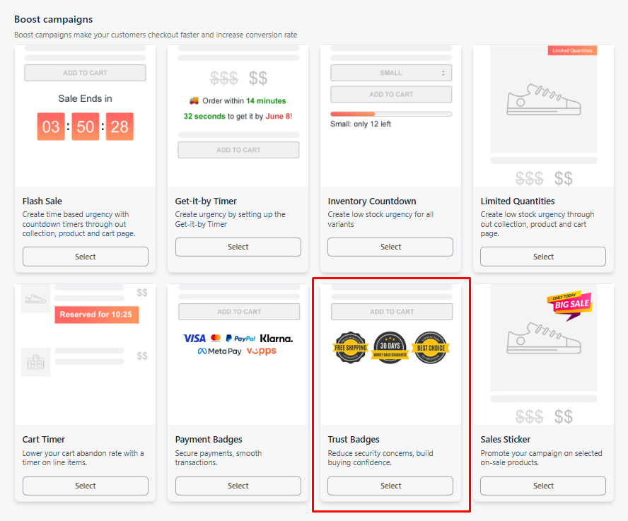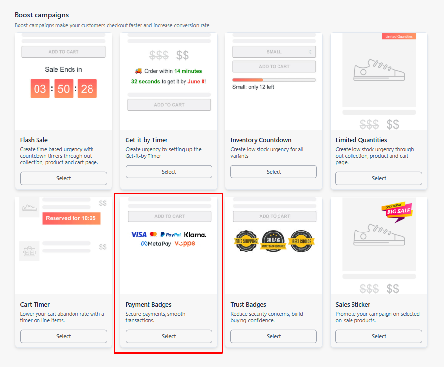 Scroll down a bit and select the Payment Badges campaign from the Boost campaigns section.