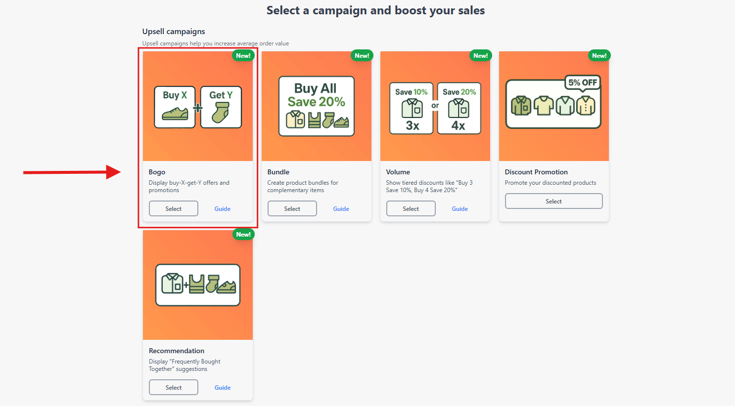 - Select Add Campaign in the top right hand corner of the app's dashboard page, and then Select BOGO from the Upsell Campaigns section.