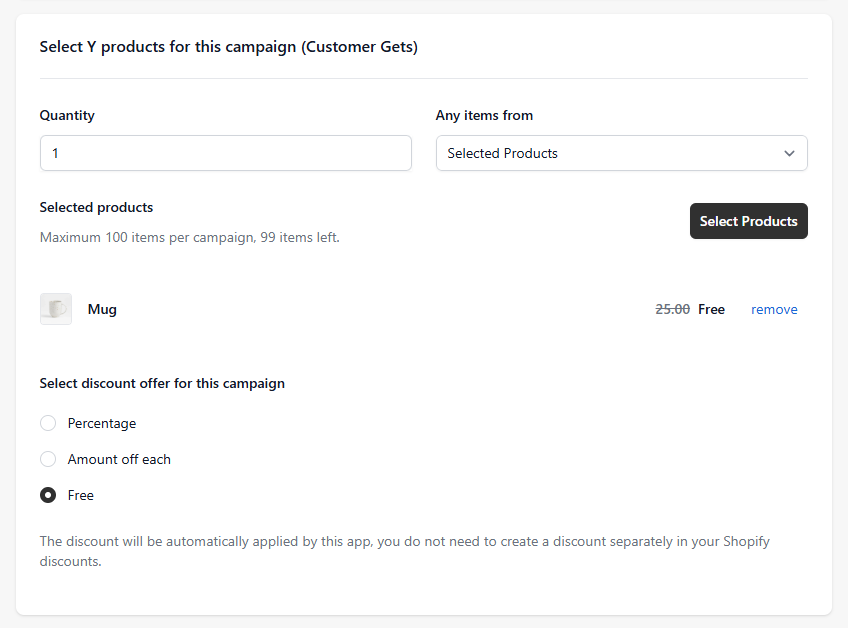 - Next, you can configure the Customer gets settings. This is the Get Y part of the Buy X Get Y campaign. You can select which products the customer gets with the Select Products button. You can select the number of items that the customer gets. You can also choose what kind of discount they receive. This can be an amount ("$10 off"), a percentage ("15% off"), or the item(s) can be received for free. In this example, they will receive one mug for free.