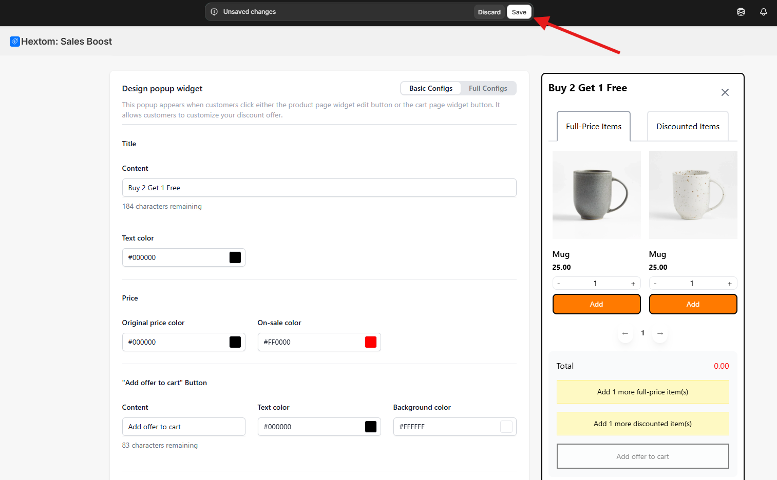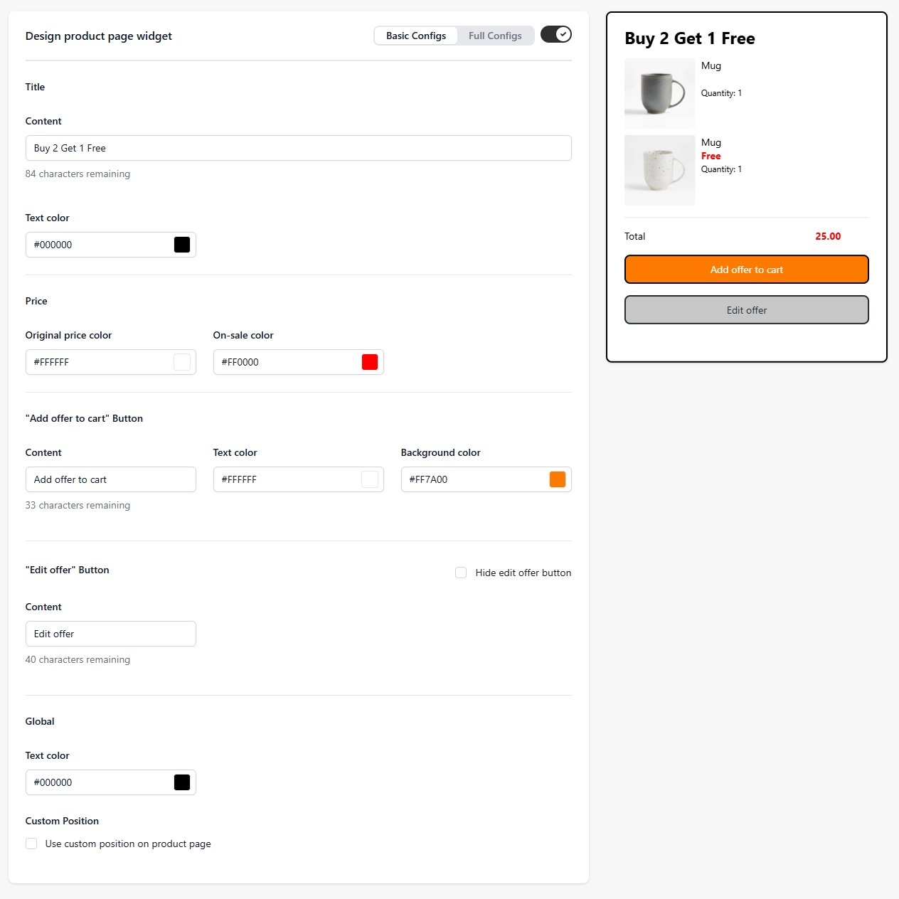 You can customize the appearance of your popup for the BOGO campaign with a variety of options using the Basic configs or Full configs. You can easily adjust the button text, text color, background color, and other elements to match your brand.