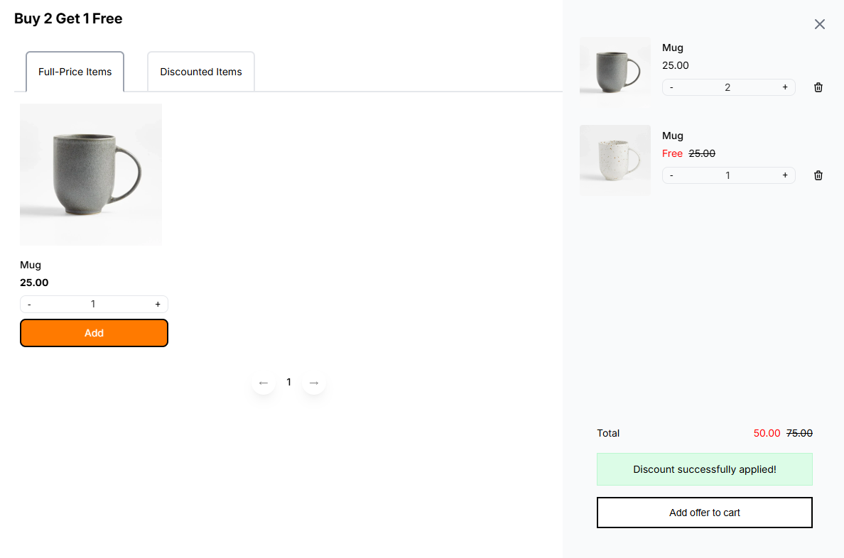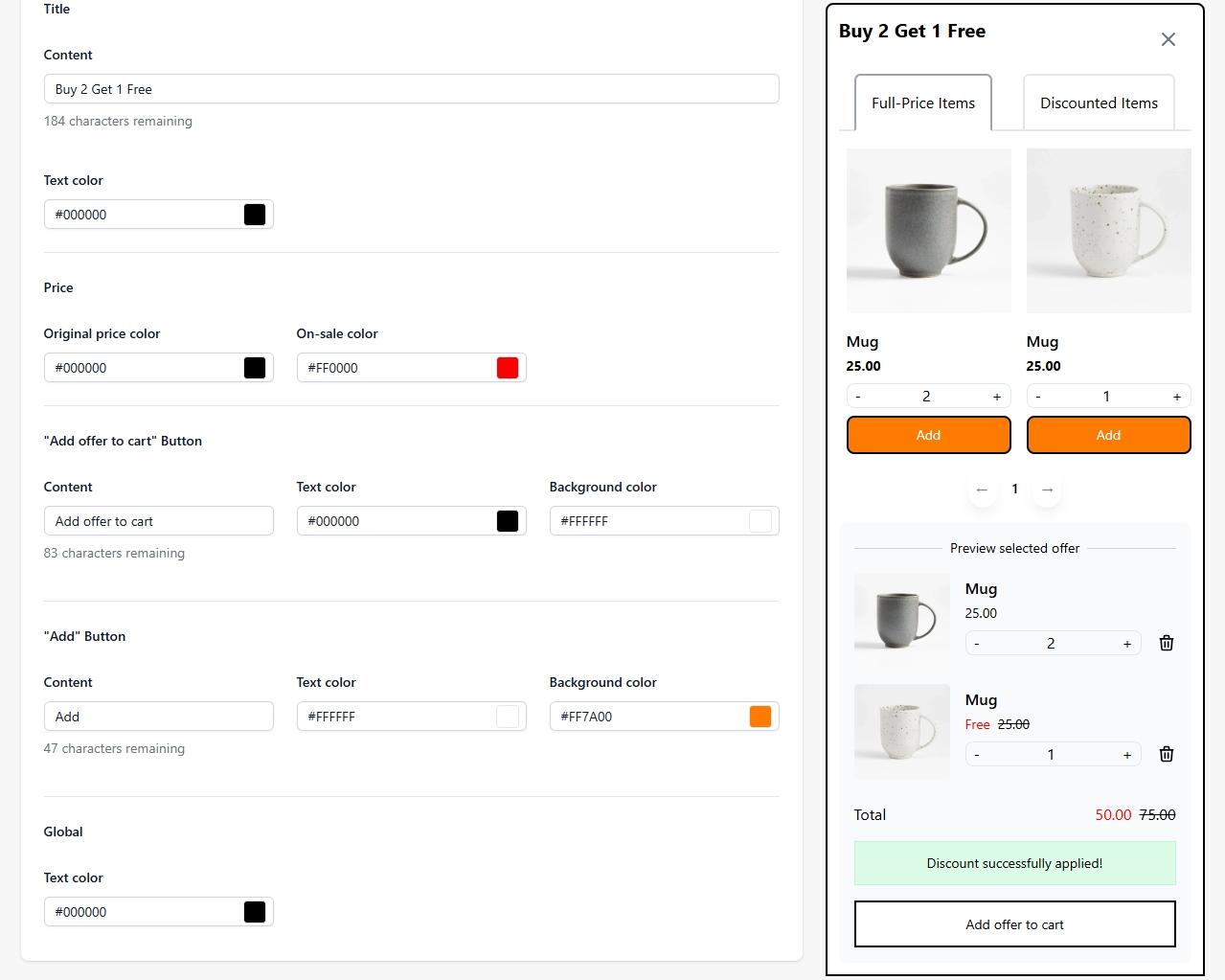 Customize the appearance of your BOGO Campaign on the product page with a variety of options. You can easily adjust the title, text color, price colors, and the Add offer to cart button, and other elements.