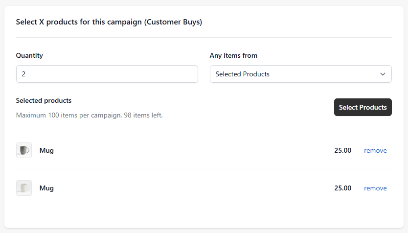 - Configure the Customer Buys section of the app's settings. This is the Buy X part of the Buy X Get Y campaign. You can set the quantity of products they need to buy, and then either select what products they need to buy. You can select a maximum of 100 products this way. We'll select a quantity of two and require that the customer buys the product mug for this example