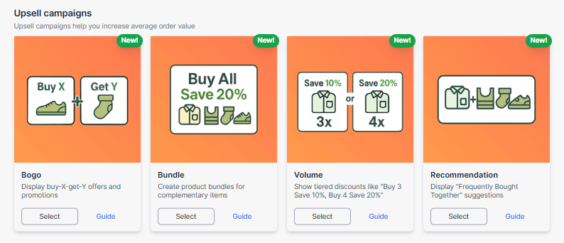 The Upsell Campaign widgets—Bogo, Bundle, Volume, and Recommendation—are focused on increasing your average order value. These widgets promote compelling offers and product suggestions that encourage customers to add more items to their carts.